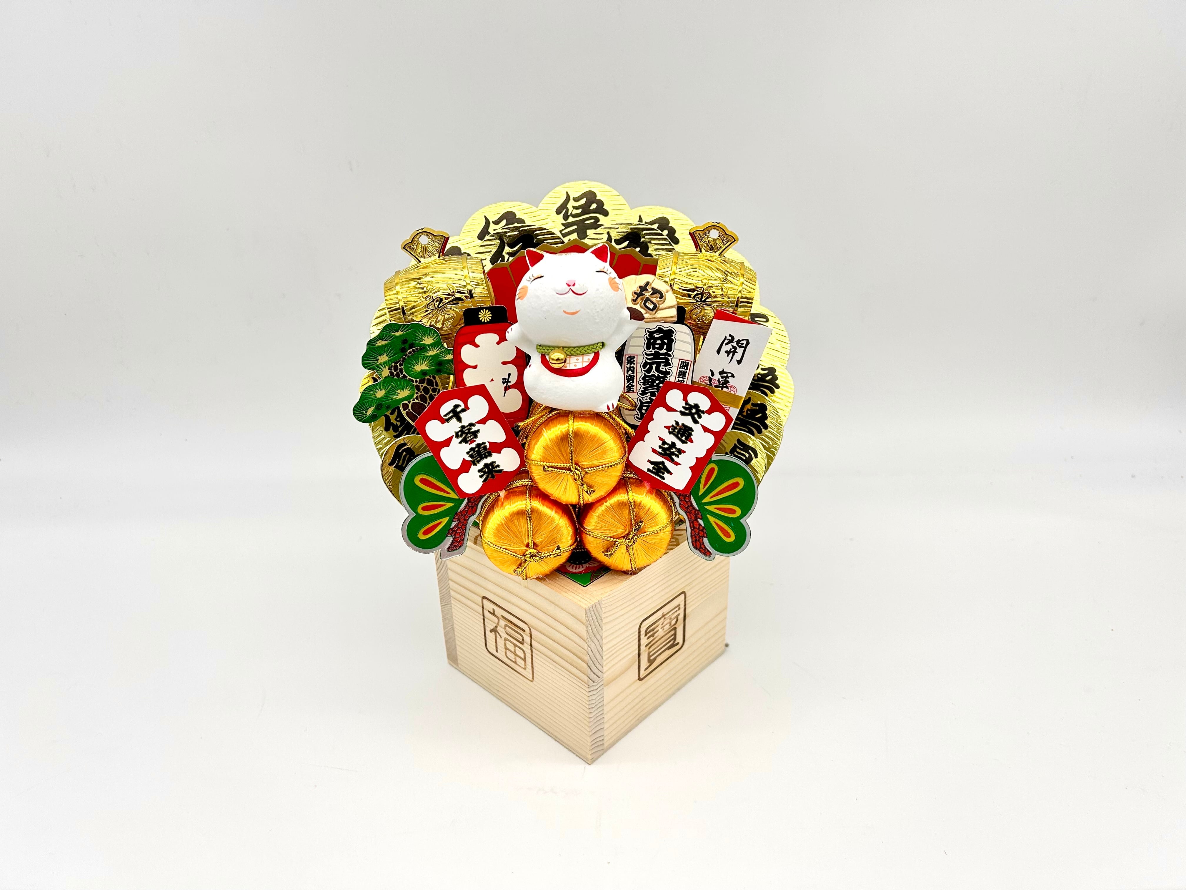 福を招く「招き猫」と、繁盛を願う縁起物熊手を、存在感ある3合マスにぎゅっと詰め込みました。